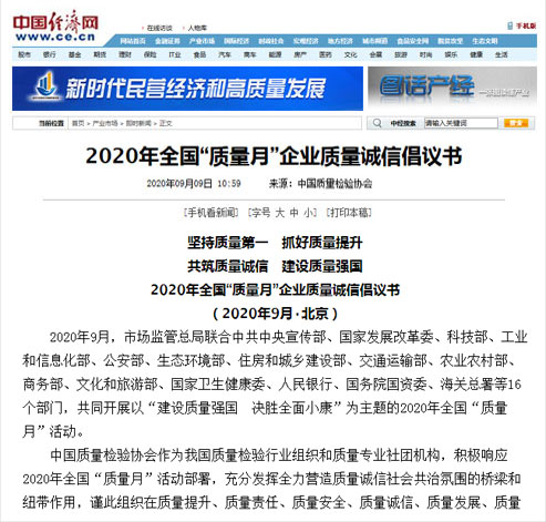 中國經濟網(wǎng):堅持質量第一 抓好質量提升 共筑質量誠信 建設質量強國——2020年全國“質量月”企業(yè)質量誠信倡議書