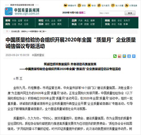 中國質量新聞網(wǎng):筑誠信抓好質量提升 齊奮進助高質量發(fā)展——中國質量檢驗協(xié)會組織開展2020年全國“質量月”企業(yè)質量誠信倡議專題活動