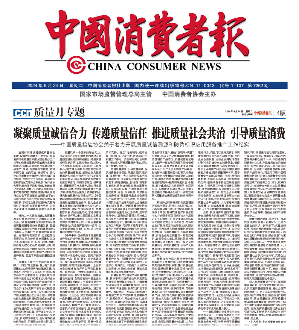 - 中國消費者報—凝聚質(zhì)量誠信合力 傳遞質(zhì)量信任 推進質(zhì)量社會共治 引導(dǎo)質(zhì)量消費——中國質(zhì)量檢驗協(xié)會關(guān)于著力開展質(zhì)量誠信溯源和防偽標識應(yīng)用服務(wù)推廣工作紀實