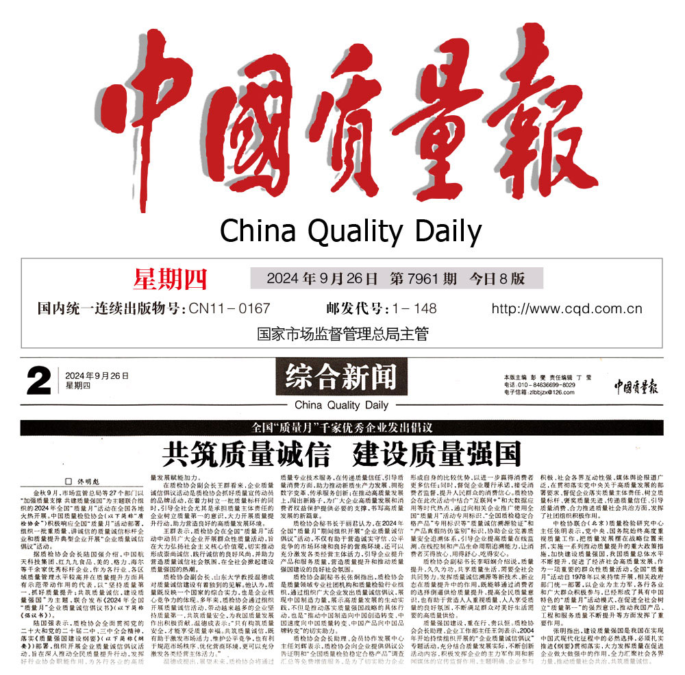 金秋9月,市場監(jiān)管總局等27個部門共同主辦的2024年全國“質(zhì)量月”活動在全國有序開展。其間,中國質(zhì)量檢驗協(xié)會(以下簡稱“質(zhì)檢協(xié)會”)以“堅持質(zhì)量第一 抓好質(zhì)量提升 共筑質(zhì)量誠信 建設(shè)質(zhì)量強國”為主題組織開展的“企業(yè)質(zhì)量誠信倡議”專題活動,得到千余家優(yōu)秀企業(yè)的積極響應(yīng)。